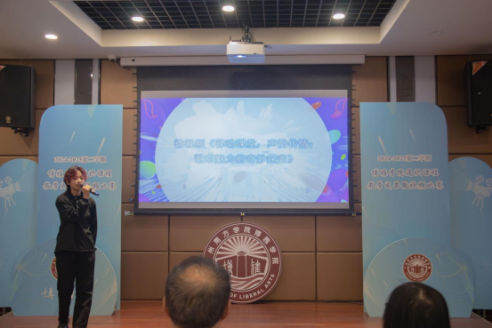 主持人介绍赛制后,各小组依次展示他们的视频成果,分享作品的创作思路与其背后的创作历程。12支来自不同模块课程的小组,内容形式异彩纷呈,立意深远,学生结合课程所学的理论知识,内化并运用在作品中,选题视角独特新颖,立足当下社会,关注热点新闻和留意生活细节,AI伦理、环境保护、中西哲学对话、教育变革与文献汇报指南、城市化影响、音乐课堂、艺术探索、科技与传统文化融合等多个维度发散,体现了学生的对社会现实的敏锐观察与关怀反思,并寄于未来的展望。评委们从内容陈述、视频内容、问题意识、三重共鸣等维度进行了专业点评,为参赛者提供了宝贵的改进建议,如加强主题契合与聚焦、提升叙事节奏、优化音画配合等。在互动讨论环节中,观众积极参与问答,分享自己认为最有创意和最打动自己的作品,增强现场参与感与互动体验,激发了参赛选手积极进取的动力。