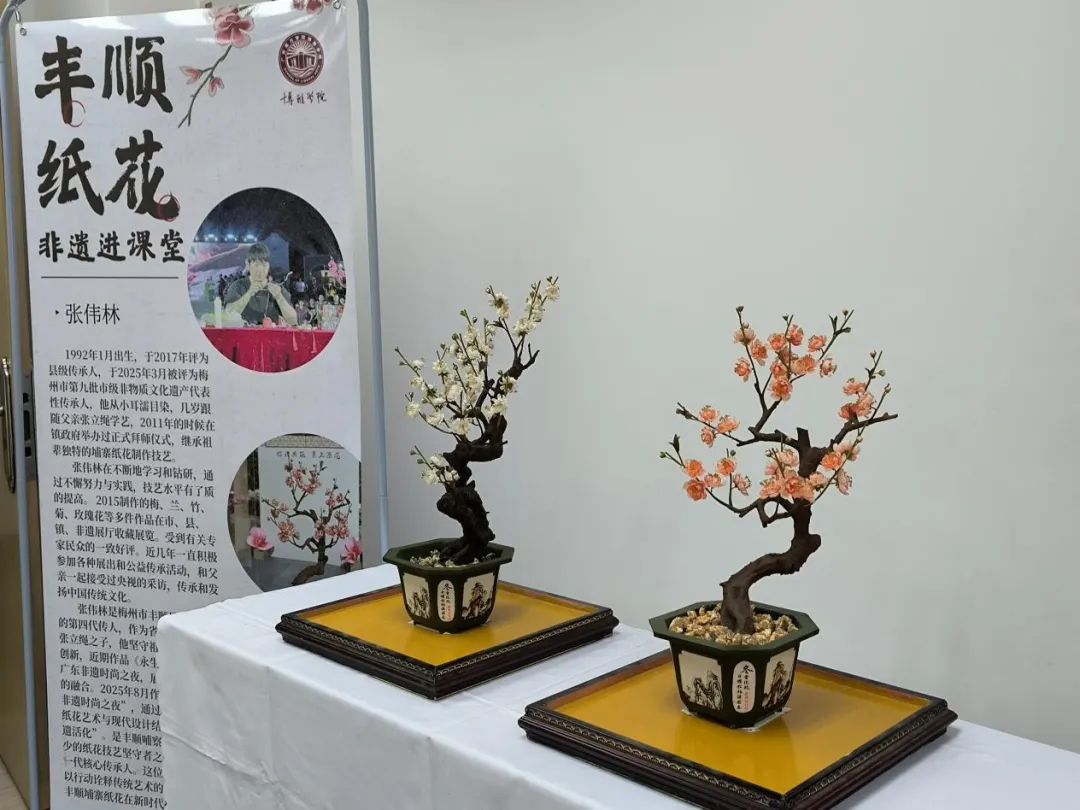 10月11日14:30,图书馆四楼会议室内,一簇簇绽放于枝头的绢红粉白,引得教师们俯身细观。这些以假乱真的纸艺花卉,正是源自广东丰顺、曾几近失传的非遗技艺。在《丰顺纸花非遗进课堂》开幕式上,纸花传承人张伟林携非遗匠心走入校园,开启了一场跨越代际的文化接力。