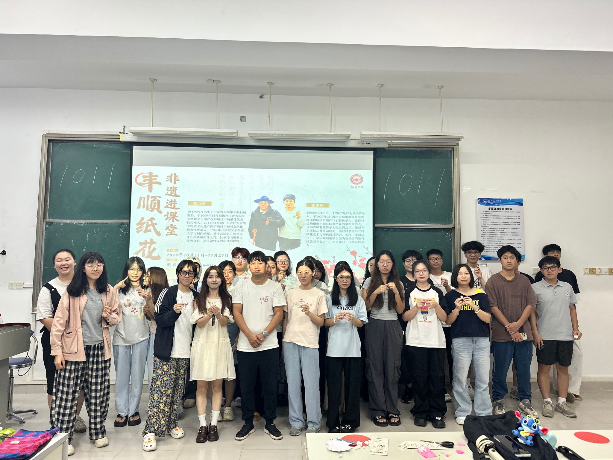 自 10 月 13 日起,梅州市第九批市级非物质文化遗产代表性传承人张伟林老师,便带着丰顺纸花技艺走进校园。本次丰顺纸花将进入34个《劳动教育》课堂,受众学生数约1020人。这场持续至 11 月 27 日的非遗课堂活动,如今,精彩仍在继续。