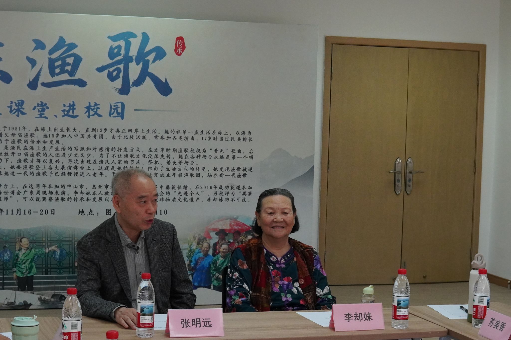 随后,惠东渔歌非遗传承人李却妹老师进行发言。她结合自身成长经历,回顾了渔民在海上漂泊的苦难岁月,阐述渔歌在苦难历程中对族群精神的慰藉与凝聚作用,强调正是这份深厚的文化情怀,让她始终坚守渔歌传承之路。李却妹老师对党的领导和国家政策带来的幸福生活表达了感恩之情,并郑重表态,将全力以赴做好渔歌传承工作,推动这一古老技艺代代相传。